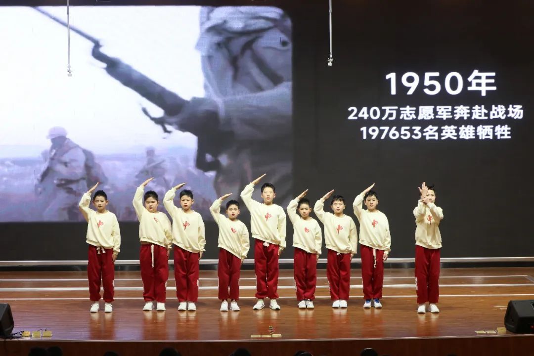 在激昂嘹亮的冲锋号声中,15名小志愿军组成的雕像站立于舞台中央,一场穿越时空的对话就此展开。同学们通过生动的表演,再现了长津湖战役中的感人瞬间,让在场的每一个人都仿佛置身于那个战火纷飞的年代。这场穿越时空的对话,不仅让同学们更加深刻地理解了抗美援朝战争的历史意义,更激发了他们传承红色基因、为实现中华民族伟大复兴的中国梦而努力奋斗的坚定信念。