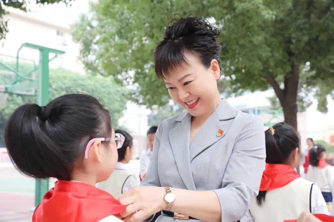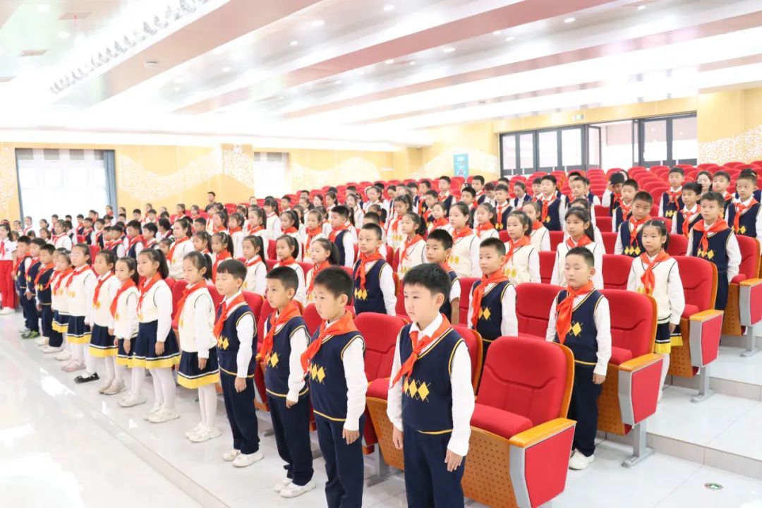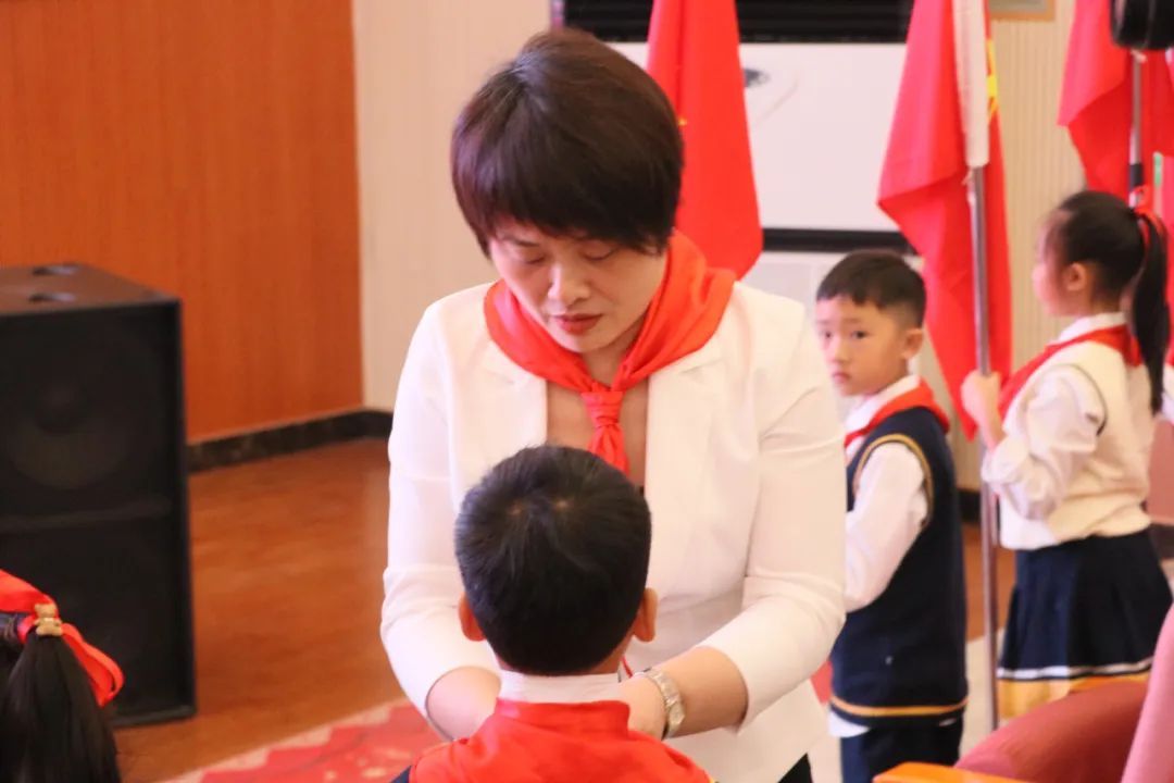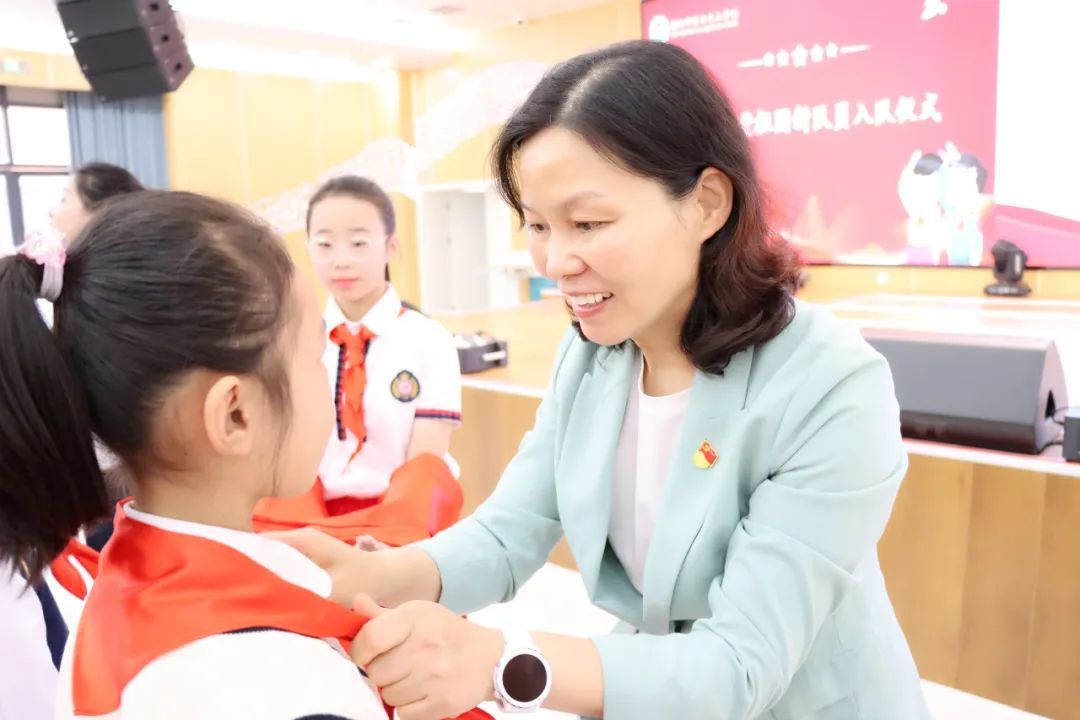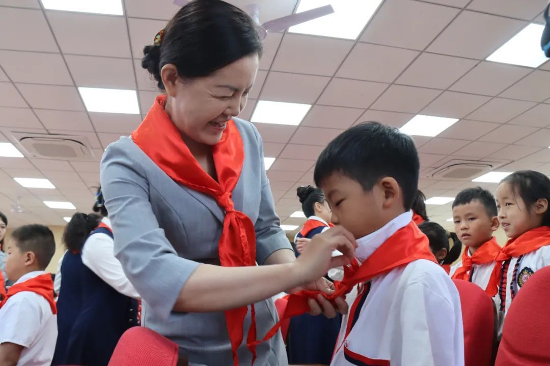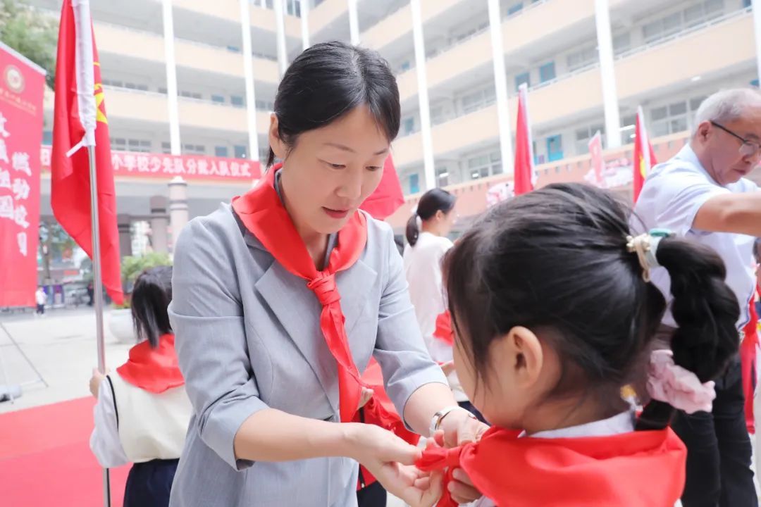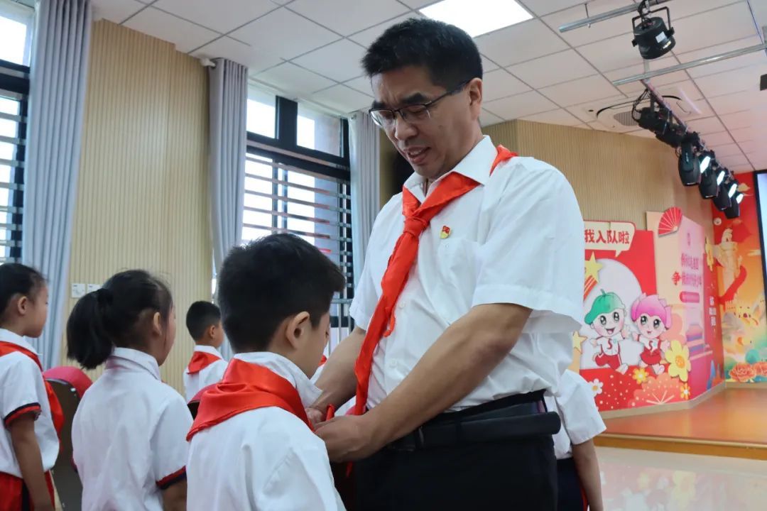 大队辅导员宣布第二批加入少先队组织的新队员名单,与会领导、嘉宾、辅导员及大队委干部为新队员佩戴红领巾。戴上红领巾不仅象征着荣耀与责任,更承载着信念与使命的传承。