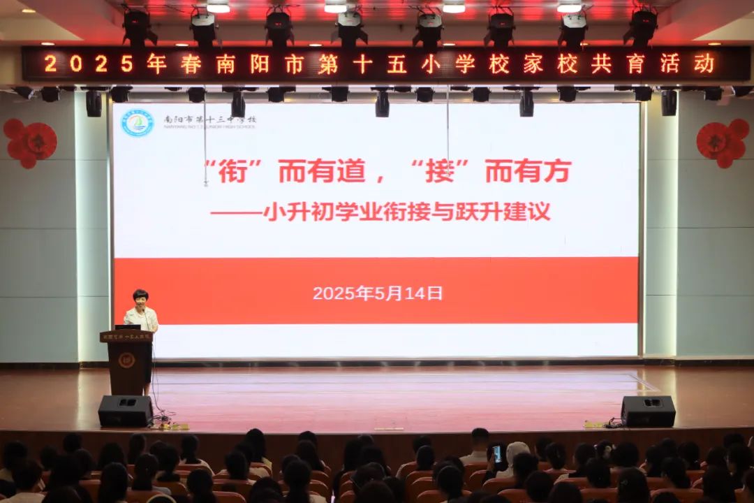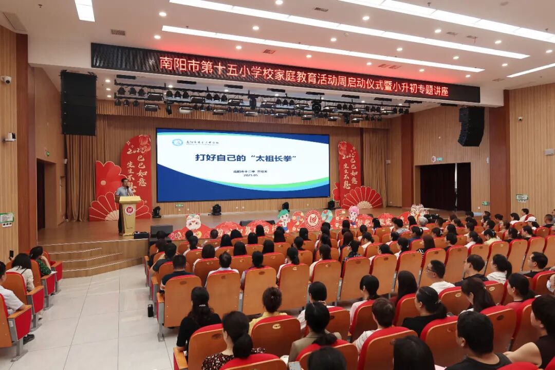 为深入贯彻落实《中华人民共和国家庭教育促进法》,深化家校协同育人机制,帮助六年级家长科学应对“小升初”的关键过渡期,南阳市十五小学校于2025年5月14日——5月20日圆满启动了家庭教育活动周并举办小升初专题指导讲座。活动以“家校协同•科学衔接•赋能成长”为主线,聚焦家庭教育热点问题,搭建专业指导平台,助力家长提升教育理念,构建家校育人共同体。 活动筹备阶段,我校组建了由校领导、班主任、心理教师构成的专项工作组。为精准把握家长们在孩子“小升初”阶段的困惑与需求,精心设计调查问卷,回收有效问卷1000余份,涵盖学科衔接、亲子沟通、学习习惯培养等问题,为活动方案提供重要依据,确保活动能够真正解决家长们关心的实际问题。 活动特别邀请到了南阳市第十三中学副校长秦守洁和优秀班主任兰经天组成专家团队莅临授课。兰经天老师基于教育实践,通过引用小说事例,结合和老师、和同学两类亲子沟通案例,给出“先不否定,然后纠偏”的沟通公式,并阐述关系第一、善治未病、修为自己三个教育认知,助力家长提升亲子教育能力。