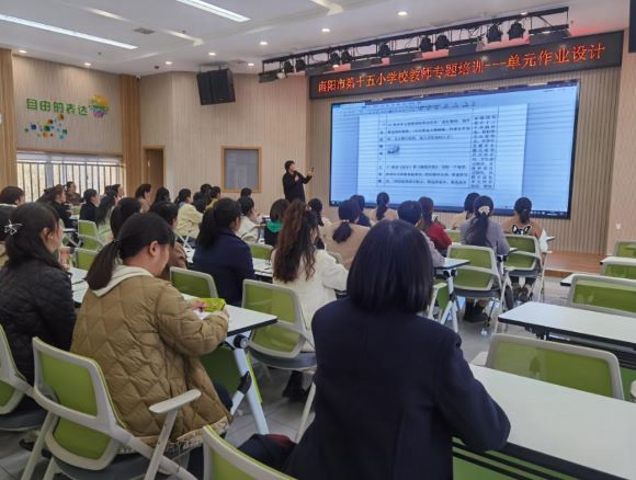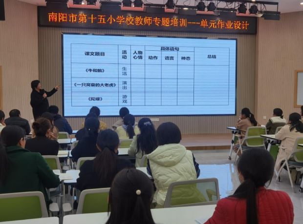 为了进一步贯彻落实新课程标准,深化教学改革,落实国家“双减”政策,培养学生综合运用知识解决问题的能力。切实减轻学生的作业负担,优化作业设计,实现提质增效。2023年3月27日,南阳市第十五小学校副校长付玉梅对老师们进行了“单元作业设计”的专题培训。