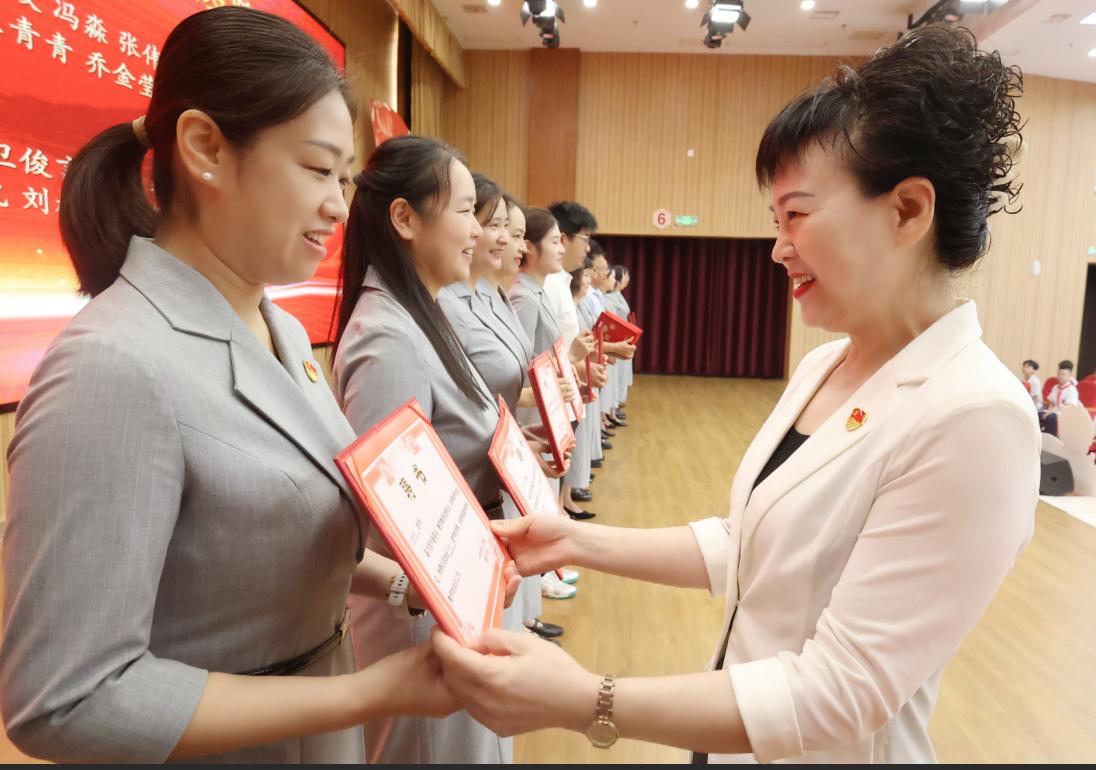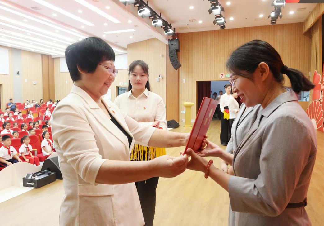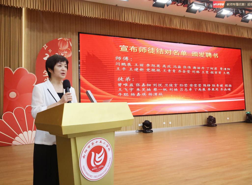 仪式中,学校党委委员、副校长付玉梅宣读了青蓝工程师徒结对名单,一个个结对组合的名字响彻会场,骨干教师的沉稳与青年教师的朝气相互映衬。这是经验与活力的精准对接,为青年教师的职业成长锚定了清晰的方向。 党委委员、副校长胡庆晓、党委副书记水琰为各位师父隆重颁发聘书。一纸聘书,一份责任;一份证书,一份担当。它不仅是学校对骨干教师教学能力与师德修养的认可,更赋予了他们“传帮带”的使命。
