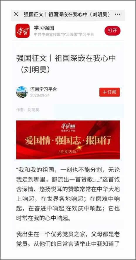 刘明昊是一个德、智、体、美、劳全面发展的“最美小学生”。他阳光、自信、友爱、正直、乐学。热爱祖国,心系疫情。他出生在党员家庭,从小心装祖国,顾全大局。2020疫情中,父母都去社区值班,他独自在家除了学习、做饭外,积极制作抗疫手抄报,创编爱国诗歌《我的祖国妈妈》《2020年的清明》等,其中《病毒肆意寒冬降 众志成城迎春回》获校“抗疫征文特等奖”;《祖国深嵌在我心中》刊登在《学习强国》河南省学习平台上。